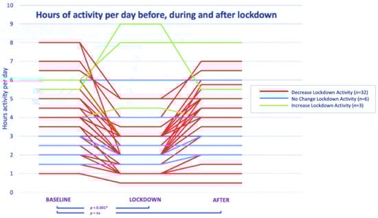 Hours of activity per day before, during, and after lockdown. * = indicates significance; ns = not significant.