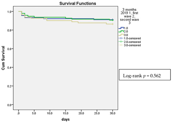 Comparison of Kaplan–Meier 30-day survival curves in STEMI patients in March–May 2019, March–May 2020 (first wave of the COVID-19 pandemic), and October–December 2020 (second wave of the COVID-19 pandemic).