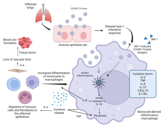 Image created from: Merad, M., 2022. Figure 1: Possible pathways contributing to hyperactivation of monocyte-derived macrophages and hyperinflammation in COVID-19.|Nature Reviews Immunology. [online] Nature.com. Available at: https://www.nature.com/articles/s41577-020-0331-4/figures/1 (accessed on 15 April 2020).
