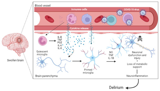 Image created from: Wilson, J., 2020. Figure 2: Inflammatory mechanisms in delirium.|Nature Reviews Disease Primers. [online] Nature.com. Available at: https://www.nature.com/articles/s41572-020-00223-4/figures/3 (accessed on 16 April 2022).