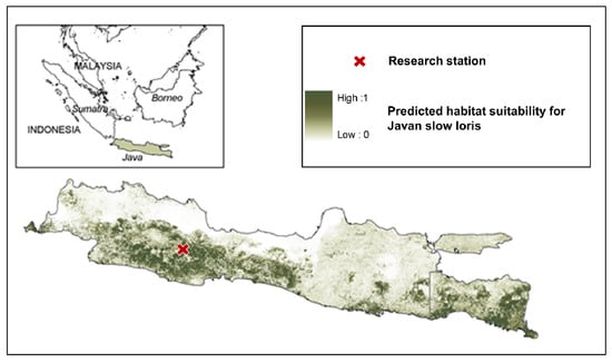 Location of the village of Cipaganti (Garut District, Java island, Indonesia), site of the volunteer program from the Little Fireface Project, in relation to the predicted geographical range of the Critically Endangered Javan slow loris Nycticebus javanicus, the focus species of the volunteer program (predicted geographical range is based on unpublished data from KAIN and VN).