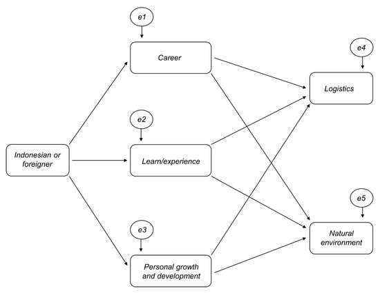 Tested Structural Equation Models to evaluate the factors affecting positive and negative perceptions between 82 foreign and local volunteers about the environment at the field site and the natural environment at the Little Fireface Project between 2013 and 2021. Variables in circles (e1–e5) represent the latent variables (i.e., error terms).