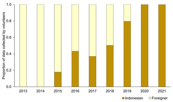 The goal of the LPF project was always to involve both local and international volunteers. In the first six years of the project, volunteer fees contributed 100% towards the renting and running of the field station and towards the salary of the housekeeper and cook. After 2016, the LFP gained sponsorship from two organizations annually that allowed these costs to be paid. This allowed us to provide local rates for Indonesian students. Even after the offer of a competitive local price, we needed to become established in order to attract or become known to Indonesian students. In 2018, much more strict permit laws were issued, meaning it became more and more challenging to allow international volunteers to come to the LFP and other conservation charities in Indonesia. This was mainly to reduce the potential negative effects for Indonesian researchers such as the so called “parachute science” (i.e., the practice whereby international researchers conduct field research in low–mid income countries and complete the study with no engagement with local researchers and communities) []. At the same time, the increase in Indonesian volunteers led to a much greater word-of-mouth transfer of information, making volunteering at the LFP a more popular choice. During the 2020 COVID-19 pandemic, when no foreign volunteers could enter Indonesia, local volunteering became more valuable than ever. Given that the level of international tourism flow was linked to the level of country exposure to COVID-19 [], having only local volunteers in 2020 and 2021 provided a safer work environment and resilience of the project. Despite several negative effects of the pandemic on international volunteer tourism [], we could see this as a positive to grow the potential of local volunteering. We noted also that the confidence in Indonesian volunteers grew and having a larger cohort seemed to foster this positivity []. We have to note that the fact that no foreigners were able to enter Indonesia in 2020/2021 might have biased the results from the feedback forms as only Indonesian volunteers were subjected to COVID-19 and this could have added additional stress to them. Nevertheless, Indonesian volunteers showed more positive attitudes towards the logistics at the research station, thus we think our results were not influenced strongly by this travel restriction.