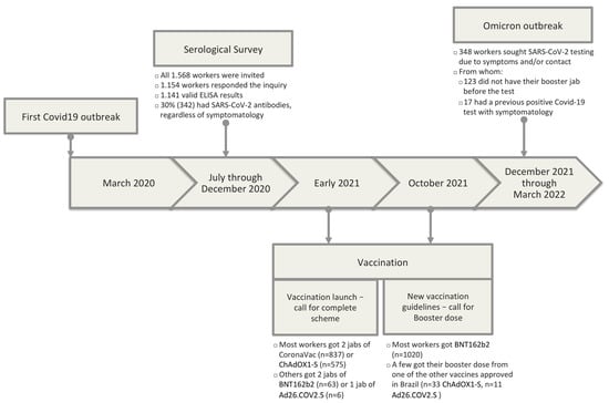 An important added contribution of the current study in comparison to our previous one is the evaluation of vaccination in our workforce. It is important to highlight that immune response to COVID-19 vaccination is dependent on several factors such as age, sex, serostatus, and pre-existing comorbidities []. In addition, despite the chronological waning of humoral response post-SARS-CoV-2 vaccination [], there has been evidence showing that vaccination could confer protection against long COVID-19 development []. Regarding the lack of association between the booster jab and positivity, our data should be interpreted cautiously because individuals who sought testing were mainly persons with mild symptoms. Therefore, it does not mean that the complete scheme or the booster jab did not protect against moderate and severe disease. In fact, none of the workers were hospitalized following SARS-CoV-2 positive testing during the Omicron wave, which argues for the effectiveness of vaccination.