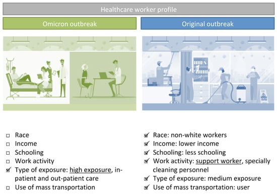 Profile shift from the first SARS-CoV-2 outbreak to the Omicron Era. Comparison between the different profiles of SARS-CoV-2 positive healthcare workers on the Omicron outbreak (green panel) and the Original outbreak (blue panel). ☑ represents statistically significant (p < 0.05) characteristics associated with SARS-CoV-2 positivity.