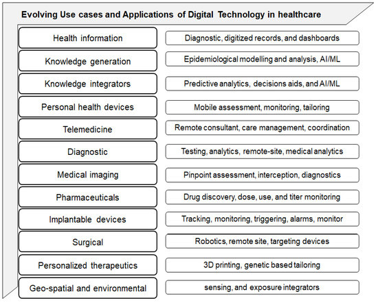 Digital technologies have now been implemented and applied to almost every aspect of health care [22], and personal data in the healthcare sector is regarded as a living thing [23]. Figure 2 groups different digital health tools into corresponding a dozen application arenas, but the individual applications number in the thousands.