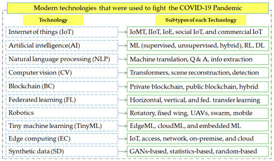 COVID-19-fighting digital technologies have helped mankind in various ways such as improved healthcare, ambient assisted living, smart services, and awareness/forecast of future events [25]. The fuel of these technologies was data concerning an individual or group of individuals that can be of multiple types such as spatial–temporal activities, demographics, medical data, and physiological readings, to name a few [26]. Although many technologies were used to fight the ongoing pandemic, only a few technologies have shown promising results in combating the pandemic. In this work, ten major technologies were chosen for painstaking analysis concerning COVID-19. However, each technology has multiple subtypes that were also employed to fight the pandemic. Figure 4 demonstrates the top ten technologies and their subtypes that have significantly helped society during the pandemic crisis. To the best of our knowledge, the role of these technologies remained unexplored in the current literature.
