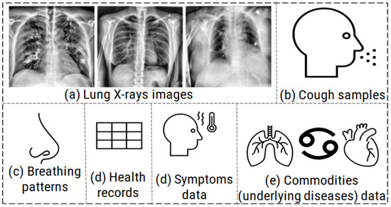 AI has tremendous applications in the healthcare sector such as drug discovery, pandemic management, diagnosis, disease prediction, decision-making, health informatics, and disease surveillance, to name a few. AI has revolutionized the healthcare industry in many ways, and modern healthcare systems are adopting AI-lead methods and tools in healthcare [43,44]. In the COVID-19 era, AI has remained in the spotlight, and helped curb the spread of COVID-19 in many ways [45]. The application of AI, such as identifying the possibility of infection from cough samples, is handy in constraining this deadly disease [46]. In the coming years, AI will be the leading technology in the healthcare sector with innovative applications that can eliminate/reduce time-consuming data collection/processing methods. Furthermore, the development of pruning and quantization techniques will likely increase the performance of AI models two- or three-fold [47]. Furthermore, the new wave of revolution in AI, such as data-centric AI, is expected to increase the reputation of AI in many industrial sectors [48,49,50]. Lastly, the ability of AI to process heterogeneous data is assisting health professionals in various ways. Figure 6 presents a brief overview of AI applications with heterogeneous data in the context of COVID-19. Table 3 presents the latest and promising applications of AI in the era of COVID-19 along with experimental details. Specifically, we discuss the applications of AI, the datasets used in experiments with AI, and the AI model employed to achieve the desired results. The detailed analysis can pave the way to understanding the pertinent role of AI in this pandemic. To the best of the authors’ knowledge, such analysis has not been reported in previous research.