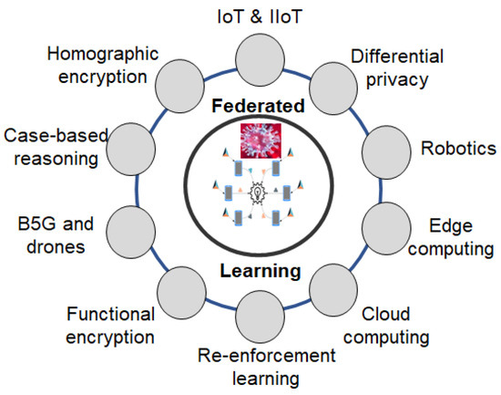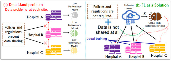 Not centralizing data, and still training large-scale AI models makes the FL a leading technology of the future. FL has many potential applications in most sectors such as healthcare, finance, supply chain, and social network analysis. Since its inception in 2017, it has been widely investigated from multiple perspectives. In the COVID-19 era, it has effectively served mankind by creating synergies with other technologies such as IoT, BC, CV, and robotics [112,113,114]. The FL can provide all services such as AI without acquiring data at some central place. Due to FL, data silos and data winter problems are effectively solved across the globe [115]. In the COVID-19 era, FL has played a vital role in management, COVID-19 detection, pandemic control, privacy protection, and policy planning [116]. Figure 10 presents an overview of the data island problem and FL working mechanism that can be regarded as the solution to this practical problem.