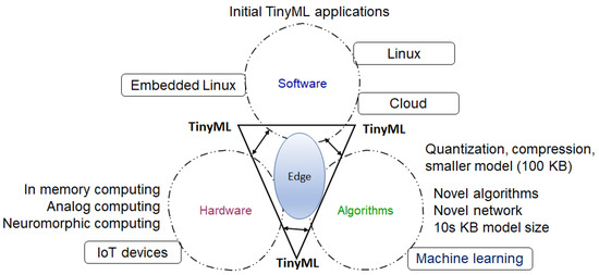 TinyML does not require a cloud, edge, or Internet connection. TinyML runs locally on the same MCU, which has the logic and control to effectively manage the connected actuators and sensors. There are two types of evolution in the context of TinyML: (i) AI in the cloud and (ii) AI at the edge [160]. TinyML is regarded as the big future of ML. Figure 12 presents the composition of TinyML paradigm. TinyML is the amalgamation of three main components: software, hardware, and algorithms.