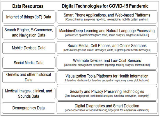 During the coronavirus disease 2019 (COVID-19) pandemic, there was tremendous growth in digital technologies, especially in the healthcare sector [1]. There are two major driving forces for this digital revolution, (i) to control the pandemic [2], and (ii) to regulate business (or education) [3]. COVID-19 has accelerated the digital revolution, and the companies which are reluctant to adopt new tools/technologies amid this paradigm shift will likely face dropping sales, or even financial difficulty to sustain their market value [4]. This pandemic has highlighted that exploiting the power of digital tools is an effective way to contain any infectious diseases [5]. Digital technologies (IoT, AI, DL, ML, blockchain, augmented and virtual reality, cloud and fog computing, big data, computational intelligence, robots, thermal scanning technologies, and drones, contact tracing mobile apps, telecommunications, and 5G) have played a dominant role in early detection and diagnosis, pre-screening, contact tracing, monitoring infected/quarantined/exposed people, trends analysis, risk estimation, mask checking, forecasting future infection rates, predicting the possibility of COVID-19 via images, cough samples analysis, and more [6]. Apart from these technologies, many fused technologies such as blockchain and federated learning, differential privacy and federated learning, big data analytics and AIoT have also helped in controlling the risks of this pandemic [7,8,9]. Some studies have been proposed to constrain/monitor the precautionary measures recommended by the World Health Organization (WHO) to control the pandemic [10]. Big data technologies have played a vital role to restrict the spread of this deadly virus by fusing huge data, and by forecasting the trends [11,12]. In addition to these technologies, a great deal of software/apps were developed to find the contacts of an infected person to lower the spread rate.