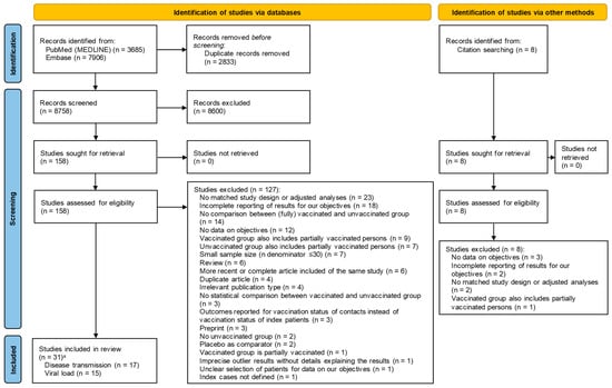 In total, 8758 unique records from PubMed and Embase were screened and 31 studies were selected in this systematic review. Of these, 17 studies [15,22,23,24,25,26,27,28,29,30,31,32,33,34,35,36,37] reported data on disease transmission, and 15 studies [16,17,18,19,20,27,38,39,40,41,42,43,44,45,46] on viral load (i.e., one study [27] reported on both disease transmission and viral load). The reasons for exclusion at full-text review are enclosed in Figure 1 and Supplement Table S2.