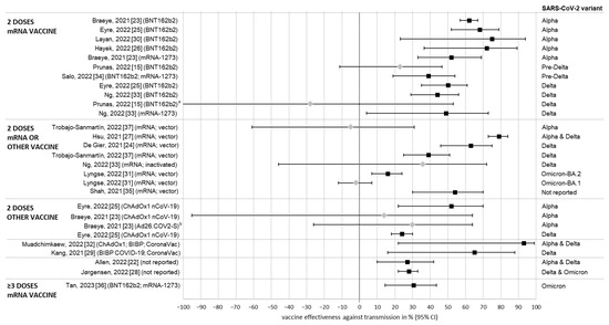 Based on our review aim and the clinical heterogeneity of the included studies (i.e., different countries and COVID-19 policies, study periods, SARS-CoV-2 variants of concern, vaccines, doses, populations, settings, testing, and outcome evaluated), the data was analyzed narratively and summarized in summary tables and figures. The data was stratified by COVID-19 vaccine (mRNA; mRNA or other vaccine; other vaccine) doses and SARS-CoV-2 variant of concern. When transmission studies reported only odds ratios (OR), relative risks (RR) or hazard ratios (HR), this was converted into vaccine effectiveness against transmission by the calculation VE = (1 − OR) × 100%, VE = (1 − RR) × 100%, or VE = (1 − HR) × 100%. When the odds ratio was reported with the vaccinated group as a reference, this was recalculated first for the unvaccinated reference as 1/OR. The original effect size and effect estimate in vaccine effectiveness against transmission are reported in the summary table.