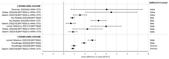 In addition, results from three studies with Ct data could not be included in the figure because of missing data. Two studies [27,41] reported significantly increased Ct values for vaccinated versus unvaccinated SARS-CoV-2-infected persons during the alpha and alpha/delta period and two studies [41,43] reported no significant effect of COVID-19 vaccination on Ct values during delta (Supplement Table S8). Four studies [39,42,44,46] reported results only on the outcome viral load for different variants of concern: three results showed a significantly decreased viral load for the vaccinated group for pre-delta and delta and three results showed a non-significant decreased viral load for delta and omicron (Supplement Table S8).