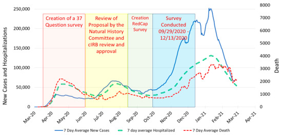 At the time of the creation of the survey, literature on the effect of the COVID-19 pandemic on clinical research was scant. Therefore, the initial survey was developed based on consensus from the study investigators and feedback from local public health experts. The survey was piloted among two local public health science staff members as well as the study investigators and coordinators involved in the development of the survey. The survey received independent feedback from the PETAL Network’s Natural History Committee before it was brought online. It focused on the following domains: (1) member demographics and hospital characteristics; (2) research staff and institutional research status; (3) COVID-19 exposure and personal protective equipment (PPE); (4) collection and processing of COVID-19 biospecimens; and (5) research obligations and institutional support. The survey was conceptualized during the initial phase of the pandemic, starting in March, and completed in June 2020, focusing on the initial impact of COVID-19 on research (Figure 1).
