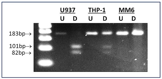 Determination of rs2228145 genotype of U937, THP-1 and MM6 monocyte-macrophage cell lines. A representative image is shown of an agarose gel containing U937, THP-1 and MM6 samples subjected to PCR/RFLP-based rs2228145 genotyping assay [43]. Lane 1: 500 bp DNA ladder; lanes 2 and 3: U937 (undigested (U) and digested (D), showing banding pattern indicative of AA genotype (i.e., PCR product cleaved into two fragments: 101 bp and 82 bp)); lanes 4 and 5: THP-1 (undigested (U) and digested (D), showing banding pattern indicative of AC genotype (i.e., intact PCR product plus two cleavage products, therefore three bands: 183 bp, 101 bp and 82 bp)); lanes 6 and 7: MM6 (undigested (U) and digested (D), showing banding pattern indicative of CC genotype (i.e., intact PCR product: 183 bp)).