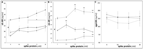Importantly, this pattern is maintained in SP-treated cells; this suggests that, in addition to sIL-6R shedding occurring at higher baseline levels, SARS-CoV-2 infection-triggered sIL-6R shedding would occur at higher levels in patients with the rs2228145 CC genotype. Therefore, taken together with reports that COVID-19 patients suffering from COVID-CSs experienced much larger sIL-6R increases (up to >125 ng/mL) than those with milder symptoms [16], our findings suggest that patients with CC genotypes might be expected, on average, to experience more severe symptoms than would bearers of AA or AC genotypes.