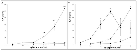 Standard protocols [39] were followed to culture MM6, THP-1 and U937 cell lines in RPMI media. As described previously [40], monocytic cells from the three cell lines were treated for 72 h with 50 ng/mL PMA to ensure complete differentiation to macrophage-like cells (referred to as dMM6, dTHP-1 and dU937). Cells were treated for 24 h with recombinant SARS-CoV-2 SP. As Barhoumi (2021) reported that SP doses of 100 nM led to significantly increased levels of apoptosis [41], whereas Buzhdygan (2020) reported no adverse effect on cell viability with 10 nM [42], we used doses of 0–10 nM SP in our experiments; this did not induce any decreases in cell viability. In some experiments, LPS (24 h; 10 ng/mL) was used as a positive control for eliciting NFkB activation, IL-6 and/or sIL-6R release or STAT3 phosphorylation. For conditioned media experiments, A549 lung epithelial cells were cultured in DMEM media. A549 cultures were treated (24 h) with supernatants from U937, THP-1 and MM6 monocytic cultures that had been exposed to SP (0–10 nM; 24 h) or were treated directly with recombinant SP (10 nM) or recombinant IL-6 and sIL-6R (50 ng/mL in both case).