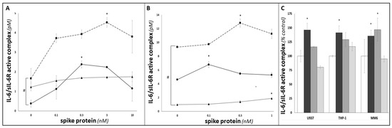 Investigation of the impact of SARS-CoV-2 SP treatment on IL-6 trans-signalling in U937, THP-1 and MM6 cultures. Data from ELISA duoset assays were inserted in Garbers et al. (2011)’s formula for calculating concentrations of the ‘IL-6/sIL-6R active complex’ [30], and hence to investigate the extent of IL-6 trans-signalling in U937 (circles; solid line), THP-1 (triangles; dotted line) and MM6 (squares; dashed line) monocytic cultures (A), or differentiated dU937 (circles; solid line), dTHP-1 (triangles; dotted line) and dMM6 (squares; dashed line) macrophage cultures (B), following 24 h treatment with SARS-CoV-2 SP. (C) shows ‘IL-6/sIL-6R active complex’ concentrations in supernatants from untreated cultures (white bars), SP-treated cultures (24 h; 1 nM; black bars) and cultures that had been pre-treated (2 h) with ACE2 blocking antibody (2 μg/mL (dark grey bars) or 20 μg/mL (light grey bars)) prior to SP treatment (n ≥ 3 in all cases; * or # denotes p < 0.05; asterisks denote comparisons versus the untreated control for the cell line in question; hash symbols denote comparisons between cell-lines).
