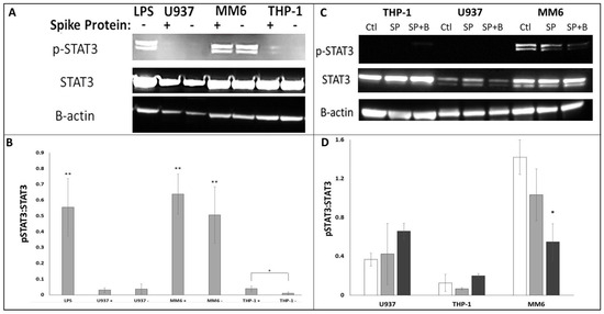 Investigation of STAT3 Tyr705 phosphorylation in U937, THP-1 and MM6 cells via Western blot analysis. Western blot experiments were performed as described in Methods, using antibodies to pSTAT3-Tyr705, total STAT3 and β-actin. (A) Representative image of a Western blot, showing STAT3 Tyr705 phosphorylation (visible as a doublet of apparent molecular weight approx. 85 KDa; upper row), STAT3 expression (apparent molecular weight approx. 80 KDa; middle row) and β-actin as a loading control (apparent molecular weight approx. 40 KDa; lower row) in U937, THP-1 and MM6 cultures ± SP treatment (or LPS-treated THP-1 as a positive control). (B) Bar graph summarising quantitative band intensity data (obtained using Image J densitometry software; n ≥ 4 in all cases; asterisks denote comparisons versus untreated THP-1 (negative control); * denotes p < 0.05; ** denotes p < 0.01). (C) Representative image of a Western blot, showing pSTAT3-Tyr705, STAT3 expression and β-actin (as a loading control) from in U937, THP-1 and MM6 cultures (untreated (‘Ctl’), SP-treated (‘SP’) and cultures that had been pre-treated with ACE2 blocking antibody (20 μg/mL; 2 h) prior to SP treatment (‘SP+B’)). (D) Densitometric summaries of pSTAT3-Tyr705: total STAT3 ratios in U937, THP-1 and MM6 cultures (Ctl: white bars; SP: black bars; SP+B: grey bars). (n ≥ 3 in all cases; asterisks denote comparisons versus the respective SP-treated culture; * denotes p < 0.05).