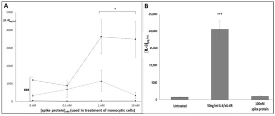 Conditioned media experiment investigating the impact of tissue-culture supernatants from SARS-CoV-2 SP-treated U937, THP-1 and MM6 cells on release of IL-8 from A549 lung epithelial cells. ELISA duoset assays were conducted as per manufacturers’ instructions to determine: (A) Levels of IL-8 release from A549 cultures, following treatment with supernatants from U937 (circles; solid line), THP-1 (triangles; dotted line) and MM6 (squares; dashed line) monocytic cultures that had been exposed to SARS-CoV-2 SP (0–10 nM; 24 h). Levels of monocyte-derived IL-8 (calculated separately) were subtracted from the total IL-8 levels seen in supernatants from the A549 cultures, as a post-hoc method of calculating the levels of A549-derived IL-8. (B) IL-8 levels in supernatants from A549 cultures treated directly with media (‘untreated’), 10 nM SP or 50 ng/mL IL-6/sIL-6R (n = 3 in all cases; *** or ### denotes p < 0.001; * denotes p < 0.05; asterisks denote comparisons versus the untreated control for the cell line in question; hash symbols denote comparisons between cell-lines).