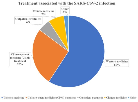 Nearly half of the respondents were diagnosed with infection by antigen testing (n = 76, 45.8%), nearly a quarter were diagnosed by nucleic acid testing (n = 40, 24.1%), and the remainder with suspected symptoms were not tested (n = 50, 30.1%). High fever (n = 120, 72.44%), fatigue (n = 110, 66.3%), and sore throat (n = 108, 65.1%) were the most common symptoms. Headache (n = 88), muscle ache (n = 80), and nasal congestion (n = 74) were reported in 53.0%, 39.6%, and 44.6% of participants, respectively (Figure 1). Over half of the patients described their symptoms as “moderate” (n = 90, 54.2%), nearly a quarter described them as “mild” (n = 40, 24.1%), and 21.69% reported “severe” symptoms (n = 36, 21.7%). Ninety-five patients took symptomatic treatments (57.2%), and seventy-one patients (42.8%) received no treatment. Treatments were diverse and were mainly Western medicines (e.g., antipyretics, cough suppressants, expectorants, etc.; n = 84, 88.4%) and proprietary Chinese medicines (such as Lianhua Qingdian capsules, Banlangen granules, Niu Huang Shangqing pills, etc.; n = 37, 39.0%) (Figure 2). The average number of days from symptom onset to recovery was 11.5 ± 16.0 days (range: 1 to 140) (Table 2).
