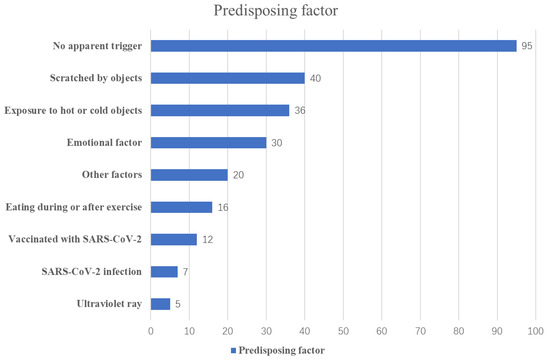 The main known triggers for patients with urticaria were no discernible trigger (n = 95, 57.2%), exercise or post-exercise (n = 40, 24.1%), eating hot or cold substances (n = 36, 21.7%), and emotional stimuli (n = 30, 18.1%) (Figure 3). Over 80% of urticaria patients had chronic urticaria, while only 15.1% (n = 25) had acute urticaria; 69.3% of patients experienced their first urticaria episode before SARS-CoV-2 infection (n = 115), 19.9% had a history of urticaria that had resolved before SARS-CoV-2 infection (n = 33), 9.0% had their first episode following the SARS-CoV-2 infection (n = 15), and 1.8% had their first episode during SARS-CoV-2 infection (n = 3). Most patients who took medications to alleviate SARS-CoV-2 symptoms reported no impact of medication use on their urticaria attack (n = 96, 81.4%), although 13 patients (11.0%) experienced symptom relief while taking medications and a few patients experienced worsening of symptoms (n = 9, 7.6%).
