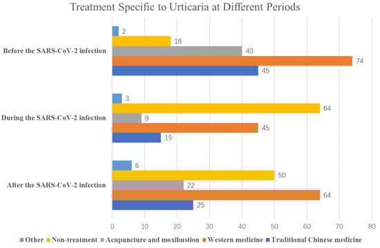 In terms of urticaria activity, our cohort reported more severe disease before SARS-CoV-2 infection compared with during infection and recovery. Also, the severity of wheals and pruritus was worse before infection than during infection and after recovery. Overall, urticaria flare-ups improved considerably during infection with SARS-CoV-2 and worsened slightly during the recovery period, in contrast to some other studies. The pandemic appears to have significantly altered the treatment of urticaria patients: before SARS-CoV-2 infection, patients were primarily treated with Western medications, traditional Chinese medicine, and acupuncture, and only a small proportion of patients did not receive any treatment. However, over half of the patients opted out of treatment during the pandemic, leading to a significant decrease in the use of Western medicines and only a small number of patients receiving Chinese medicine or acupuncture treatment. After SARS-CoV-2 infection and recovery, patients increasingly received Western medicines, Chinese medicines, and acupuncture, albeit at lower levels than before COVID-19 infection. Additionally, the proportion of patients receiving no treatment decreased but remained higher than pre-infection levels. It is reasonable to hypothesize that the main reason for the significant increase in the proportion of patients not receiving treatment and the significant decrease in the proportion of patients taking Western treatments was because patients isolated at home did not feel well during their COVID-19 illness, decreasing their ability to buy medications or to attend clinics. In addition, since urticaria disease activity decreased and flare-ups improved during SARS-CoV-2 infection, this may have reduced the need for treatment.
