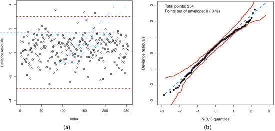In addition to global influence measures, analyzing residuals can also be an effective way to assess model adequacy and check for incompatibilities with the response distribution. The deviance residuals for the GOLLL regression are