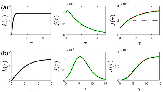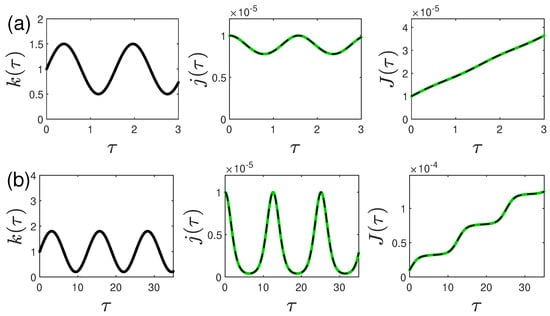 Left panels: Plot of the oscillating ratio of according to Equation (46) for (a) , , and (b) , . Centered panels: The corresponding rates of new infections of as a function of reduced time using . Right panels: Cumulative fraction of . Shown are the numerical (black dashed curve) solutions of the SIR set of equations in (6) in comparison with the analytical approximations (green curve) according to Equations (47) and (48). Because for case (a), only the first term of expansion (48) had to be used, while the first three terms of Equation (48) were used in (b) in accord with Figure 4. The agreement is almost perfect. The maximum relative deviations are smaller than 0.2% for all cases.