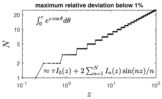 The integral is approximated for all within precision by the integrated Equation (49), thus resulting in the expression shown inside the figure if the z-dependent order of the summation, N, is chosen as depicted. The required order grows as .