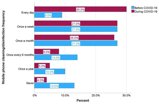 In this study, most participants cleaned/disinfected their mobile phones once a week or once a month before COVID-19, while during the COVID-19 pandemic, most of them did so every day. Similar results were observed in the study by Ahmad et al., where 22.4% of participants cleaned their phones daily, 27% weekly, and 19.7% once a month [38]. However, while there is a significant increase in daily mobile phone cleaning/disinfection during COVID-19, compared to the period before the COVID-19 pandemic, a relatively large proportion of undergraduate students still performs inadequately in terms of mobile phone cleaning/disinfection frequency.