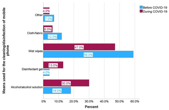 As for the cleaning/disinfection methods of students’ mobile phones, wet wipes were the most popular means used by the majority of undergraduate students before COVID-19 as well as during the COVID-19 pandemic, followed by alcohol/alcohol solution, disinfectant gel, cloth/fabric, and other means. Similarly, in the study by Ahmad et al., wet wipes were used by the majority of participants (38.6%) in order to clean their mobile phones, followed by alcohol-based disinfectant solution (16.6%), hand sanitizer (12%), and other means (2.7%) [38]. In this study, however, it is worth mentioning that during the COVID-19 period, the use of cloth/fabric, wet wipes, or other means became less popular and were partially replaced by alcohol/alcohol solution and disinfectant gel.