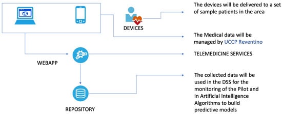 Figure depicts the architecture of the proposed system. The devices were delivered to a set of patients selected by medical doctors from the cohort of patients who received the fourth dose of the Covid vaccine. The monitoring device stores the parameters in a secure cloud compliant with the GDPR regulations. The UCCP reventino monitored the parameters through the web app provided by the SiDLY system. Finally, the anonymized parameters of the patients were collected into a secure repository. Such data were then gathered and used to feed the decision support system of the project to monitor the pilot and to learn a predictive model based on neural networks.