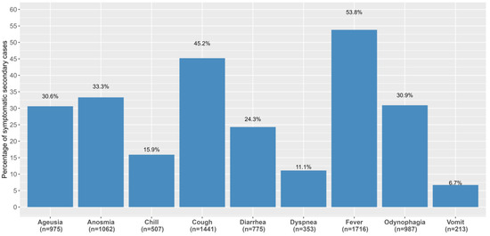 Typology of COVID-19-like symptoms developed among secondary cases (SCs). Note: SCs could report one or more symptoms; percentages are calculated from an overall 3190 sample of SCs.