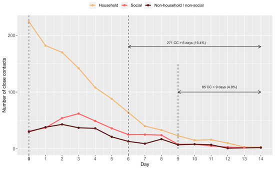 We observed a progressive decrease in the percentage of symptomatic CCs throughout the 14-day quarantine, primarily up until 6 days from IC exposure (Figure 4). Nevertheless, 15.4% of SCs developed symptoms after day 6 and only 4.8% after day 10 of quarantine (Figure 4). Significant differences by the setting of exposure were observed (p < 0.05), and non-household CCs were more likely to SD after 9 days and onwards (household: 3.9% vs. social: 4.9%) (Table 3).