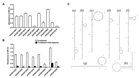 The ten most enriched aptamer sequences were evaluated for their binding to SARS-CoV-2 trimer S protein using an ELISA-based binding assay. The recombinant SARS-CoV-2 trimer S protein was immobilized on a MaxiSorp plate, and biotinylated aptamers were incubated with immobilized protein. Bound aptamers were detected using streptavidin–HRP. All aptamers exhibited binding ability except AYA2012005 and AYA2012010 (Figure 2A). The specificity of the aptamers with good binding affinity was determined using competition ELISA-based binding assay (Figure 2B). For this purpose, one-hundred-fold excess of the non-biotinylated aptamers was added to the wells with respective biotinylated aptamers. If binding is specific, non-biotinylated aptamers compete out biotinylated aptamers, and absorbance at 450 nM will significantly decrease. As shown in Figure 2B, all tested aptamers were competed out with one-hundred-fold excess of the non-biotinylated respective aptamers and demonstrated specific binding to the SARS-CoV-2 trimer S protein. The predicted secondary structures of selected aptamers are shown in Figure 2C. All selected aptamers have a hairpin structure with the unpaired loop size ranging from 4 nucleotides (AYA2012002) to 14 nucleotides (AYA2012003, AYA2012008, and AYA2012009). AYA2012001 and AYA2012006 share an almost identical predicted secondary structure, as the only difference is the A/G change at site 7. The increased base pairs in AYA2012007 and AYA2012009 as compared to others could result in enhanced stability. It is worth noting that the selected aptamers are rich in G nucleotides, indicating that the formation of the G quadruplex, which has been identified as a common motif in many DNA aptamers, may improve the stability of these aptamers [49].