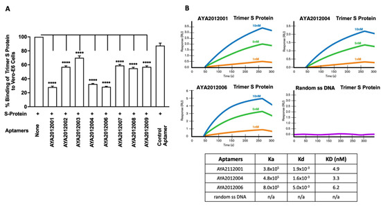 Aptamers’ inhibition of the binding of SARS-CoV-2 trimer S protein to ACE2 receptors expressed on the surface of Vero E6 cells. (A) Inhibition of binding of SARS-CoV-2 trimer S protein to ACE2 receptors expressed on the surface of Vero E6 cells. S protein at 10 nM was added to Vero E6 cells after pre-incubation with 5 μM of the indicated aptamer. Random 40 nucleotides ssDNA was used as a control. After 1 h incubation, unbound S protein was washed out, and the cell pellet was solubilized with 1% Triton X100. The supernatant-containing solubilized His-tagged SARS-CoV-2 trimer S protein was applied to the nickel-coated plate. The His-tagged S protein bound to nickel was detected using mouse monoclonal antibodies against S protein and horseradish peroxidase-conjugated goat anti-mouse antibodies. Each value was the average of duplicate measurements. Error bars represent mean ± SD (). p-values were determined with one-way ANOVA and Dunnett’s multiple comparison test. **** denotes p < 0.0001. (B) Binding affinity for aptamers with the best inhibitory activity. Characterization of the affinity between aptamers AYA2012001, AYA2012004, AYA2012006 and SARS-CoV-2 trimer S protein with surface plasmon resonance (SPR). Random 40 nucleotide ssDNA was introduced as control.