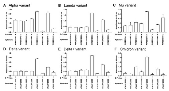 Since the pandemic started, the SARS-CoV-2 virus has mutated frequently [52], and mutations in the SARS-CoV-2 S proteins have conferred an advantage to the virus. For example, the N501Y mutation in B.1.1.7 (Alpha), T487K, P681R, and L452R mutations in B.1.617.2 (Delta), K417N mutation in AY.1/AY.2 (Delta plus), D614G, P681H, and D950N mutations in B.1.621 (Mu), G75V, T76I, Δ246-252, L452Q, F490S, D614G, and T859N mutations in C.37 (Lambda), T478K, Q498R, and H655Y mutations in B.1.1.529 (Omicron) have been shown to majorly contribute to the virus’s ability to become more infectious, bind more tightly to human cells ACE2 receptors, and evade vaccines and some neutralizing antibodies [53,54,55,56,57]. In this study, ELISA-based binding assay was performed to determine if selected aptamers could recognize the mutated S proteins of the COVID-19 variants (Figure 4). Recombinant SARS-CoV-2 trimer S proteins from (A) Alpha, (B) Lambda, (C) Mu, (D) Delta, (E) Delta plus, and (F) Omicron variants were immobilized on a MaxiSorp plate. Biotinylated aptamers were added, and bound aptamers were detected using streptavidin–HRP. As seen in Figure 4, our aptamers demonstrated different binding affinities to the SARS-CoV-2 trimer S protein variants with AYA2012006 and AYA20122008 showing the best binding to all variants and aptamer AYA2012009 showing the best binding to Mu as compared to other tested variants. This presents the advantage of potentially developing combined therapy consisting of aptamers that can target different variants of the S protein.