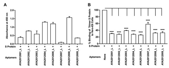 Our aptamers are specific for the SARS-CoV-2 S protein, since they did not display any binding to influenza H1N1 hemagglutinin proteins, SARS-CoV-2 nucleocapsid protein, or plasma proteins. Modified aptamers AYA2012004_L and AYA2012004_L-M1 blocked the binding of the trimer S protein to ACE2 receptors expressed on the surface of VeroE6 cells as determined by the ELISA-based assay as well as flow cytometry using anti-S protein antibodies.