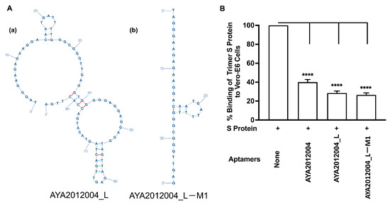Characterization of modified aptamers. (A) Aptamers modification. The predicted secondary structures of (a) AYA2012004_L, (b) its truncated modification AYA2012004_L-M1. The secondary structure analysis of AYA2012004_L was performed using the mfold webserver. The default environment was used for folding, which includes 37 °C as the folding temperature and 0.2 M of Na. The secondary structure of AYA2012004_L as well as its truncated modification AYA2012004_L-M1 are shown. The truncation was performed by removing the big loop (nucleotides from position 38 to 85) from the AYA2012004_L. (B) Cell-based binding assay of SARS-CoV-2 S-protein trimer to ACE2 expressing Vero E6 cells in the absence or presence of the modified aptamers. His-tagged SARS-CoV-2 trimer S protein (10 nM) was incubated with Vero E6 cells in the absence or presence of the indicated aptamers (5 μM). After 1 h incubation, unbound S-protein was washed out, and the cell pellet was solubilized with 1% Triton X100 for 1 h. Supernatant containing solubilized S protein was applied to the nickel-coated plate. The His-tagged trimer S protein bound to nickel was detected using mouse monoclonal antibodies against S protein. Each value was the average of duplicate measurements. Error bars represent mean ± SD (). The p-values were determined with one-way ANOVA and Dunnett’s multiple comparison test. **** denotes p < 0.0001.