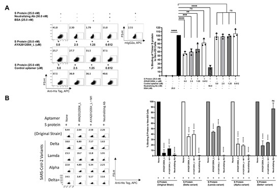 Flow cytometry study on inhibition of SARS-CoV-2 trimer S protein binding to ACE2 receptors on the surface of Vero E6 cells by selected aptamers. (A) Concentration-dependent inhibition of SARS-CoV-2 trimer S protein binding to Vero E6 cells by aptamer AYA2012004_L. SARS-CoV-2 trimer S protein was pre-incubated for 1 h in absence or presence of aptamer (AYA2012004_L) at different concentrations, anti-SARS-CoVv2 RBD-neutralizing antibodies or control aptamer with random 40 nucleotides ssDNA in 100 μL PBS supplemented with 1 mM Mg as indicated. S protein with or without aptamers or anti-SARS-CoV-2 RBD neutralizing antibodies were then incubated for 30 min with Vero E6 cells (10 per well) at 4 °C followed by washing two times. Cells were stained with secondary antibody, anti-his-tag-APC or control antibody and fixable viability dye eFluor 450 on 4 °C for 30 min, which was followed by washing. Cells were fixed and acquired by flow cytometry. Anti-SARS-CoV-2 RBD-neutralizing antibody (50 nM) was used as a positive control for aptamer inhibition, and BSA or none was used as a negative control for trimer S protein binding. Each value was the average of triplicate measurements. p-values were determined with two-way ANOVA and Tukey’s multiple comparison test. ** denotes p < 0.002, *** denotes p < 0.0002, and **** denotes p < 0.0001. (B) Inhibition of different SARS-CoV-2 trimer S-protein variants binding to ACE2 receptors on the surface of Vero E6 cells by selected aptamers. Trimer S protein (12.5 nM) from the indicated SARS-CoV-2 strains was pre-incubated in the absence or presence of 5 μM of aptamers (AYA2012004_L and AYA2012004_L-M1) in 100 μL PBS plus 1 mM MgCl for 1 h at room temperature, which was followed by incubation with Vero E6 cells (10 per well) for 30 min at 4 °C. After incubation, cells were washed two times and stained with secondary antibody, anti-his-tag-APC or control antibody with fixable viability dye eFluor 450 on 4 °C for 30 min, which was followed by washing, fixing and then acquired by flow cytometry. Anti-SARS-CoV-2 RBD-neutralizing antibody (30 nM) was used as a positive control for aptamers inhibition. Data from one representative of three independent experiments are shown. Results are shown in percent of binding of S protein. Error bars represent mean ± SD (). p-value were determined with one-way ANOVA, Dunnett’s multiple comparison test. **** denotes p < 0.0001.