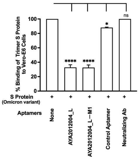 Inhibition binding of Omicron SARS-CoV-2 trimer S protein to ACE2 receptors on the surface of Vero E6 cells by selected aptamers. His-tagged Omicron SARS-CoV-2 trimer S protein was incubated with Vero E6 cells in the absence or presence of the indicated aptamers or anti-SARS-CoV-2 RBD neutralizing Ab at 30 nM. After 1 h incubation, unbound S protein was washed out, and the cell pellet was solubilized with 1% Triton X100 for 1 h. Supernatant containing solubilized S protein was applied to the nickel-coated plate. The His-tagged trimer S protein bound to nickel was detected using mouse monoclonal antibodies against S protein and horseradish peroxidase-conjugated goat anti-mouse antibodies. Each value was the average of duplicate measurements. Error bars represent mean ± SD (). p-values were determined with one-way ANOVA, Dunnett’s multiple comparison test. * denotes p < 0.015 and **** denotes p < 0.0001.