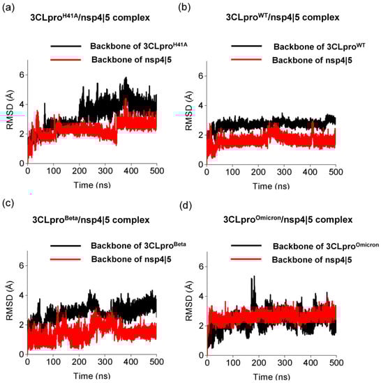 Structural changes of different 3CLpro while interacting with nsp 5|6 substrate. Backbone root-mean-square deviation (RMSD) of (a) 3CLproH41A, (b) 3CLproWT, (c) 3CLproBeta, and (d) 3CLproOmicron.