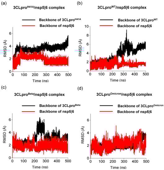 Next, we investigated backbone RMSD of the substrate nsp 5|6 while interacting with 3CLproH41A, 3CLproWT, 3CLproBeta, and 3CLproOmicron. Such substrates presented low binding affinity by 3CLproH41A []. Thus, both substrate and 3CLpro variants are expected to show large conformational changes in molecular dynamics simulations. Indeed, both substrate nsp 5|6 and the enzyme variants showed large variability in the RMSD values and, in each case, a different structural behavior was observed, even maintaining the same experimental conditions. Although RMSD of nsp 5|6 presented convergence in ~280 ns, the mutation from H41 to A41 caused significant structural changes of the 3CLproH41A, mainly while interacting with this low binding affinity substrate. Conversely, we observed that nsp 5|6 presented less structural variability, mainly after ~250 ns. The 3CLproBeta and 3CLproOmicron showed different backbone RMSD profiles in the simulation (Figure 2c,d). Note that the substrate nsp5|6 exhibited similar variability of the backbone RMSD while interacting with these variants. However, 3CLproOmicron showed better structural stability than 3CLproBeta while interacting with this substrate. Thus, changes in the structural stability of nsp 4|5 and nsp 5|6 in the active site of the 3CLpro variants play a key role in the substrate/enzyme complex interaction. Strengthening these interactions increases the binding affinity of these molecules to the active site, an effect often deployed as a basic principle in drug design. Indeed, previous molecular dynamics studies showed that 3CLpro in complexes with inhibitors of high binding affinities have stable active sites []. Therefore, the stability of both substrates in 3CLpro of VOCs demonstrate the effectiveness of accommodation of high and low affinity substrates in the active site in order to facilitate the cleavage process.