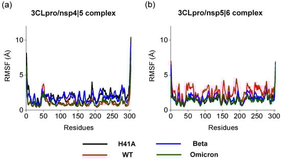 Backbone root-mean-square fluctuation (RMSF) of the 3CLproH41A, 3CLproWT, 3CLproBeta, and 3CLproOmicron. (a) Backbone RMSF of the 3CLproH41A, 3CLproWT, 3CLproBeta, and 3CLproOmicron while interacting with nsp 4|5. (b) Backbone RMSF of the 3CLproH41A, 3CLproWT, 3CLproBeta, and 3CLproOmicron while interacting with nsp 5|6.