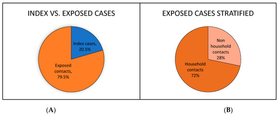 (A) Percentage of participants qualifying as index cases vs. exposed contacts. (B) Percentage of exposed contacts qualifying as household contacts vs. non-household contacts.