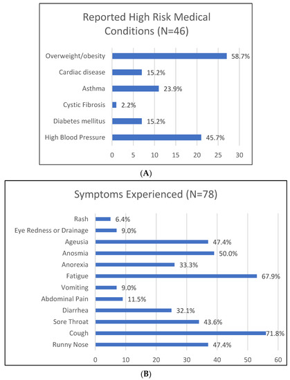 (A) Number and percentage of participants who reported a condition that is considered high risk in the setting of COVID-19 infection. (B) Percentage of study participants that experienced symptoms that may be attributed to SARS-CoV-2.