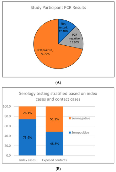 (A) Percentage of participants who had previously undergone Polymerase Chain Reaction (PCR) testing. (B) Percentage of index cases who were seronegative vs. seropositive compared to the percentage of exposed cases that were seronegative vs. seropositive.