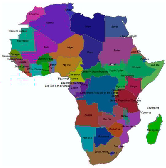 Africa is regarded as the second-largest and most populous continent after Asia. The continent has a land area of about 30.3 million km2, including adjacent islands; it covers 6% of Earth’s total surface area and 20% of its land area. Africa’s population was about 1.3 billion in 2018, which accounts for about 16% of the world’s human population. The size of the population is estimated to be 1.4 billion in 2022 (16.7% of the world’s population). The map of the study area is presented in Figure 1. A total of 54 African countries were considered for the study.